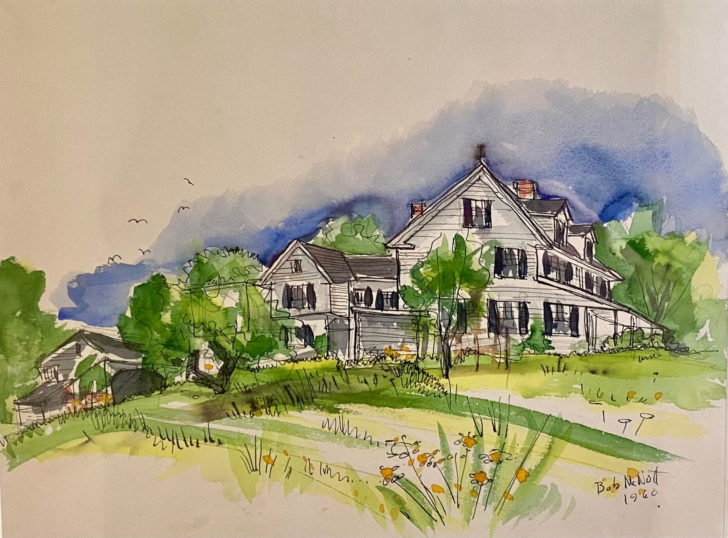 *The illustration for this post is a watercolor my father Robert A. McNutt, painted in 1960 during his first visit, and mine, to Camden. As an architect, he was enthralled by the unique yet classic construction of the stately old house with several more recent add-ons, such as bathrooms, sunroom and more modern annex. When I visited two years ago, my cousin asked if I had seen my father’s watercolor. I said, “He didn’t do watercolors!” She led me to a wall off the dining room and this painting looked back at me, signed by my father. Of course he could do illustrations such as this. He was an architect, after all, and did renderings for clients all the time. I now have an excellent reproduction of this painting in my dining room, and I had a second one made for my cousin Bob who shares my father’s name.